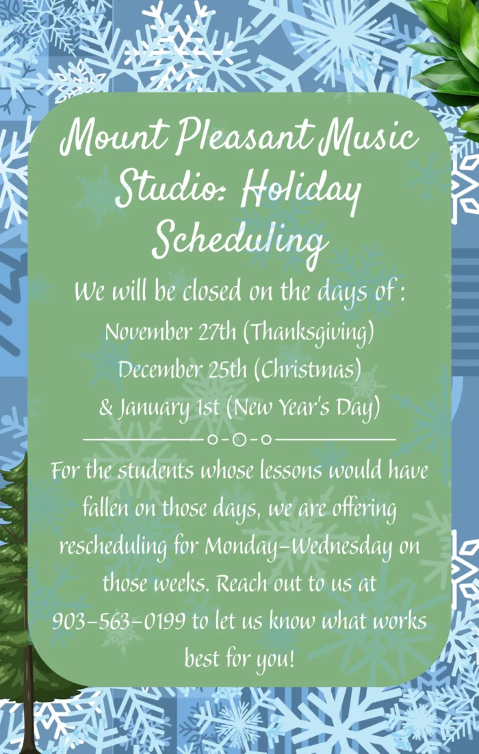 Feel free to call/text us at 903-563-0199 or email us at MPMusicStudio@Yahoo.com about what Holiday scheduling works best for you! Post navigationPreviousPrevious post:We Are Pleased To Debut Our Fall Semester Of Music Munchkins!