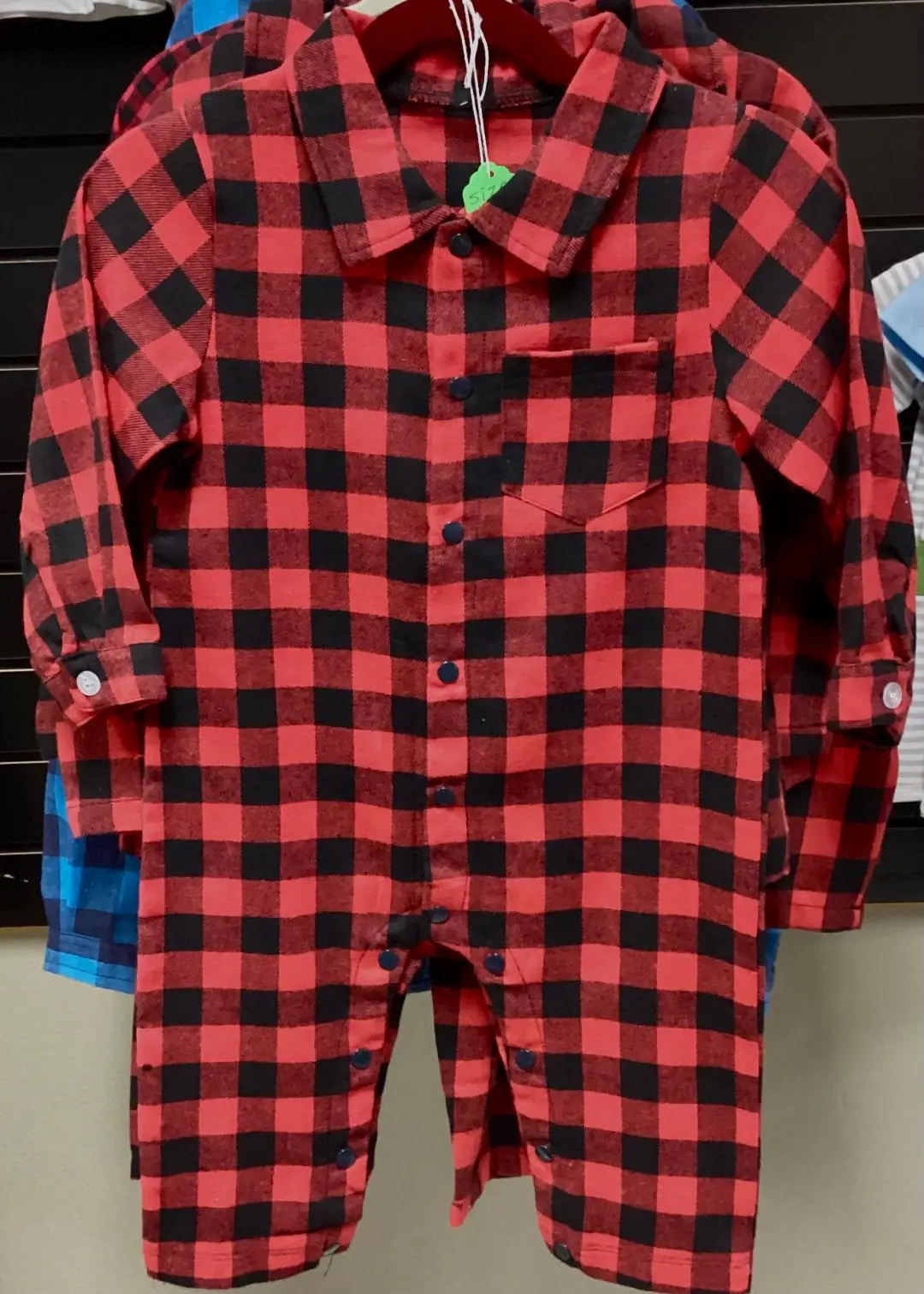 This adorable pajama set features a red buffalo check with button closure and a chest pocket. The infant sizes are onesies with button closure, and ages 2+ are a collared shirt and pants combo, making it versatile for children of any age.