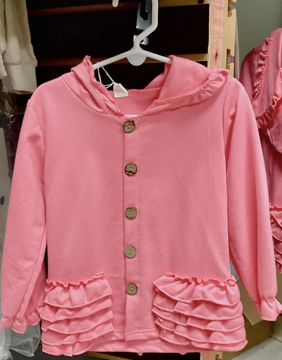 This jacket, while also coming in navy and pastel pink, is an adorable candy-pink color perfect for all-year round; whether winter chills or unseasonal cold spells.