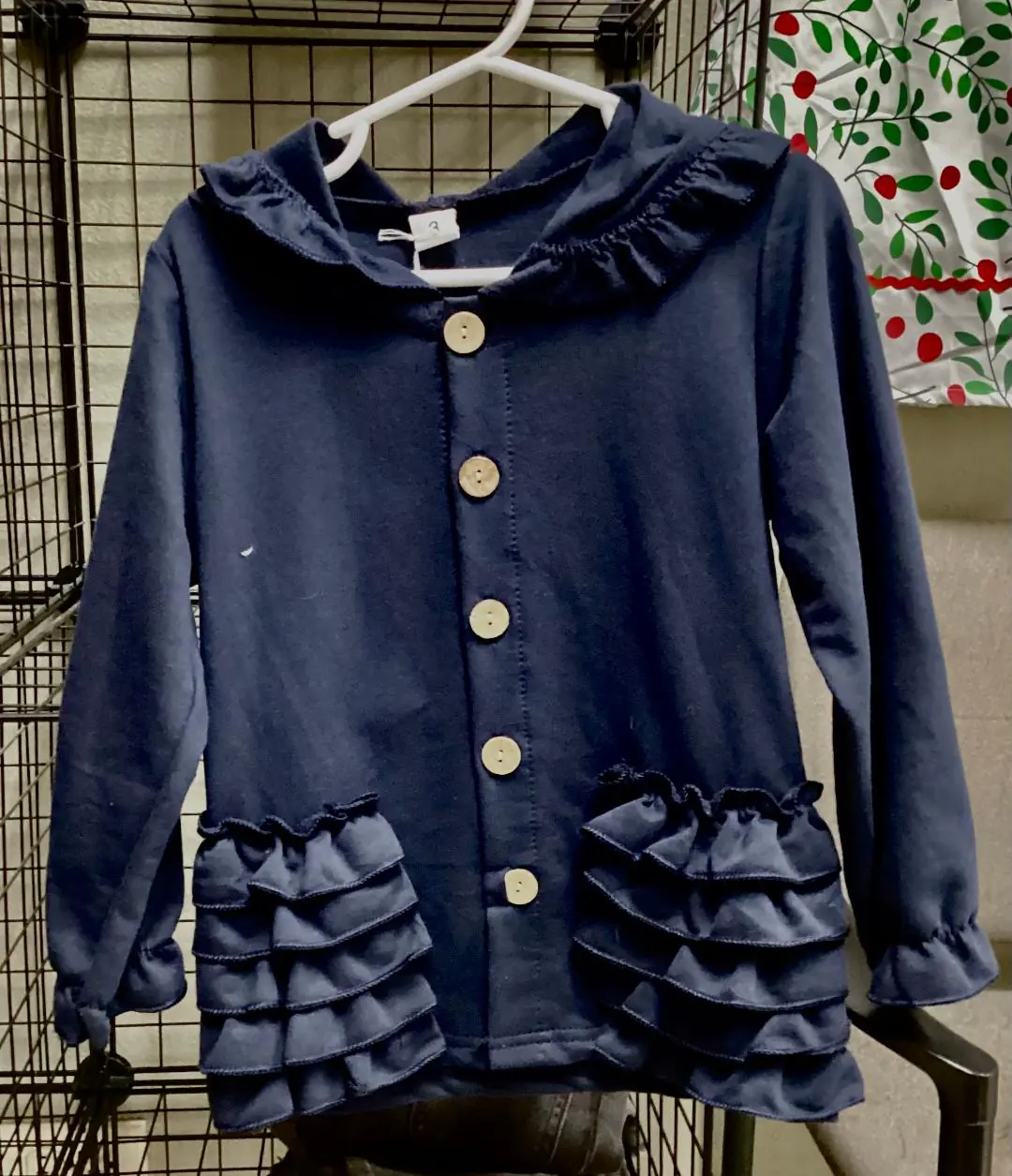 This adorable jacket is an excellent staple piece with its neutral, navy coloring. The ruffles around the neckline, hood, and waist add an element of interest and playfulness.