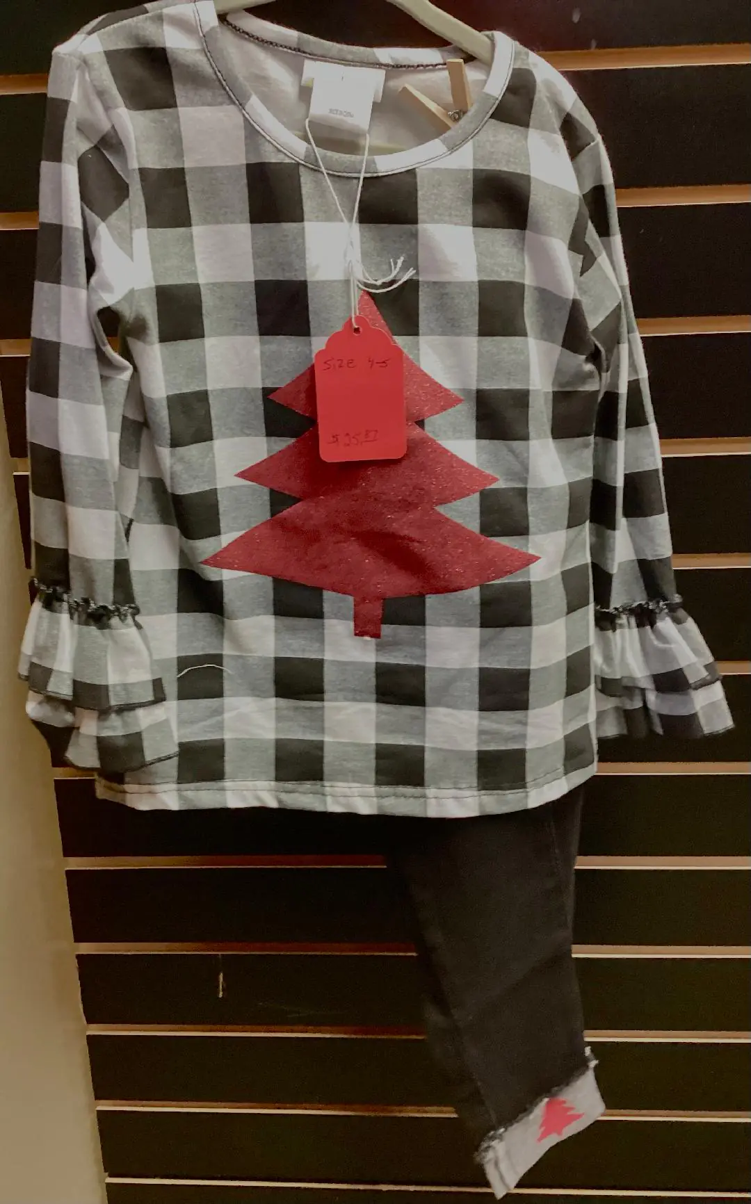 This set feature a monochrome buffalo check top with black denim-style pants, simple and comfortable in the cold season.