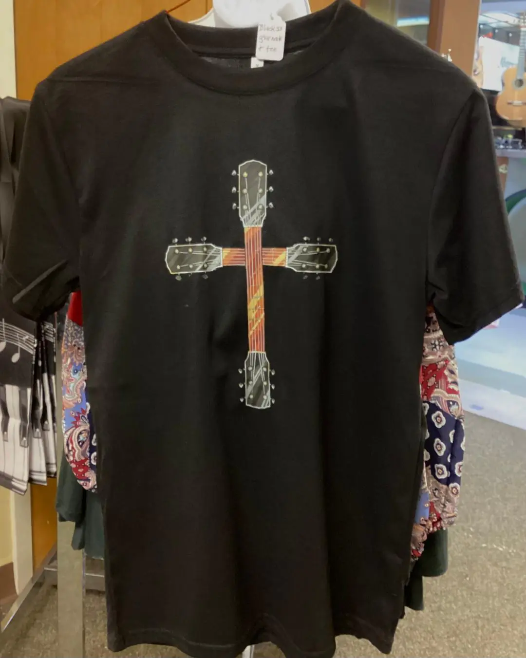 This black tee features a guitar neck graphic and comes in numerous sizes, having a relaxed fit that makes it incredibly versatile.