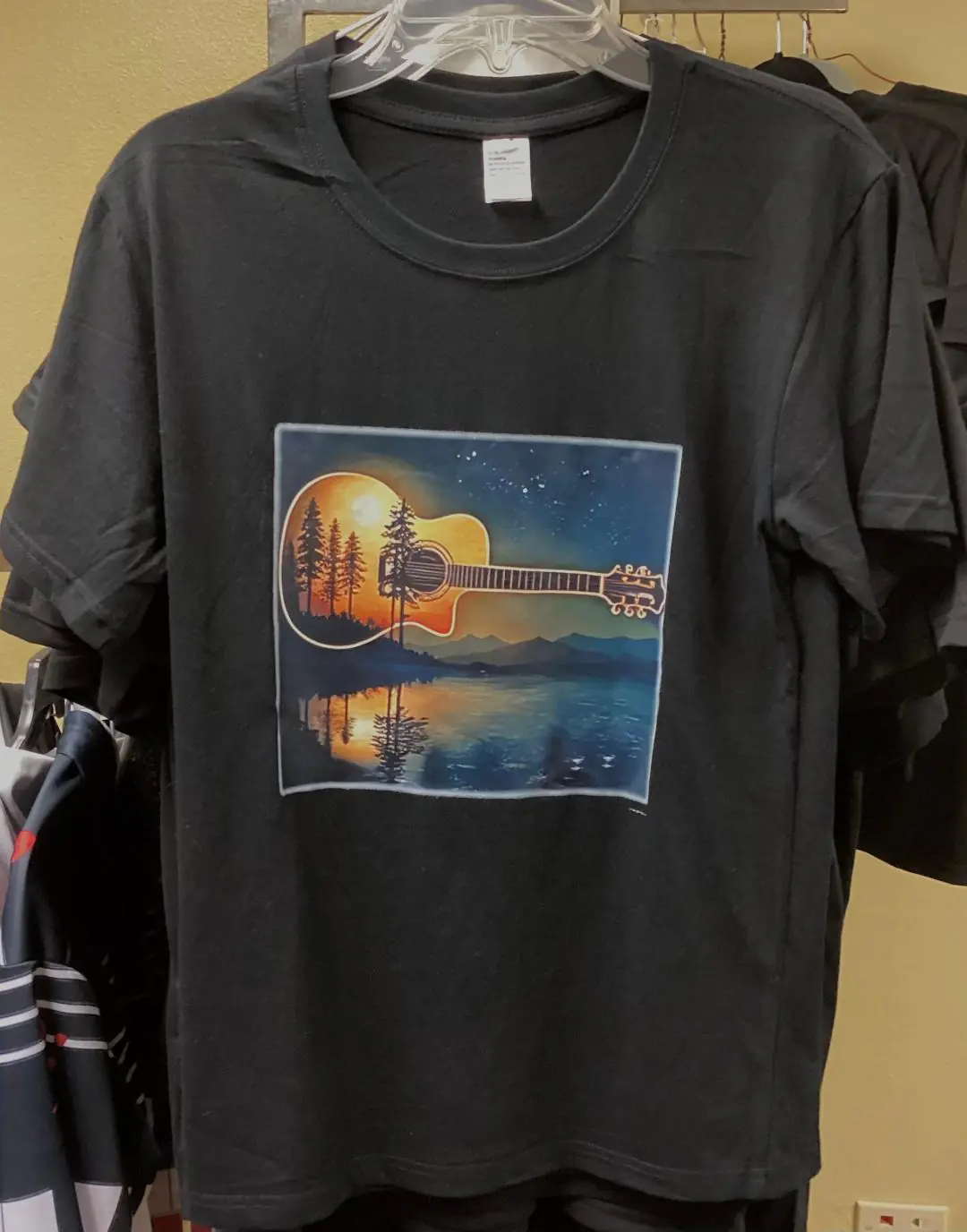 This tee features a graphic night vista with a guitar in the place of the moon, and is comfy and cozy for any situation.