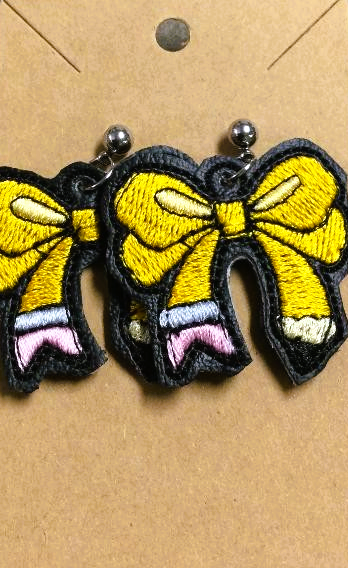 These unique embroidered earrings feature bows made out of pencils! These are post drop earrings and their total length is 1-1/2″.