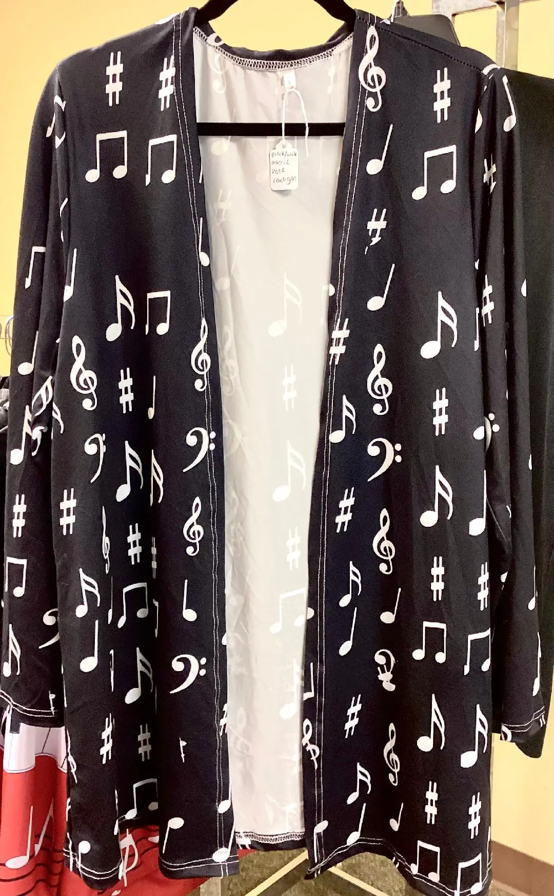 This cozy, oversized shrug features a sheet music pattern and is an excellent accompaniment for any event in which one might catch a chill.