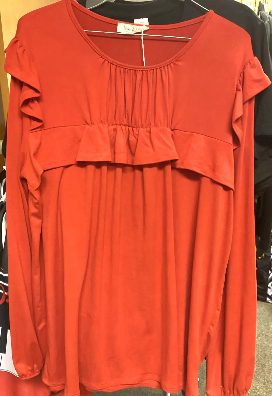 This blouse comes in a soft, drapey fabric and a bright red color. It features long sleeves with ruffles at the shoulder, an empire waist with ruching and more ruffles.