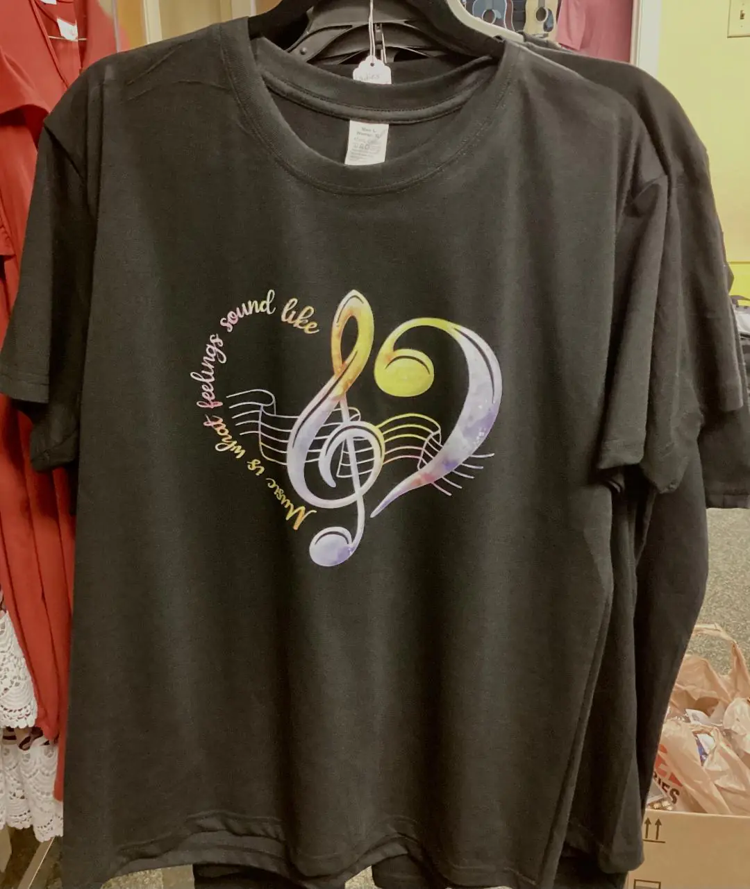 This cozy graphic tee comes in black with a yellow treble clef shaped into a heart.